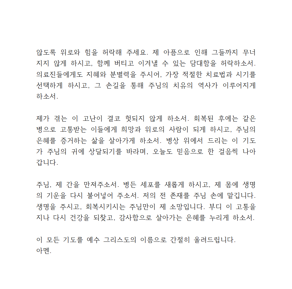 제가 겪는 이 고난이 결코 헛되지 않게 하소서. 회복된 후에는 같은 병으로 고통받는 이들에게 희망과 위로의 사람이 되게 하시고, 주님의 은혜를 증거하는 삶을 살아가게 하소서. 병상 위에서 드리는 이 기도가 주님의 귀에 상달되기를 바라며, 오늘도 믿음으로 한 걸음씩 나아갑니다.