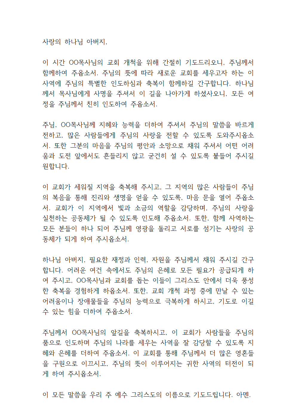 이번 기도문은 새롭게 교회를 개척하거나 창립하면서 창립예배를 드릴 때의 기도문입니다.