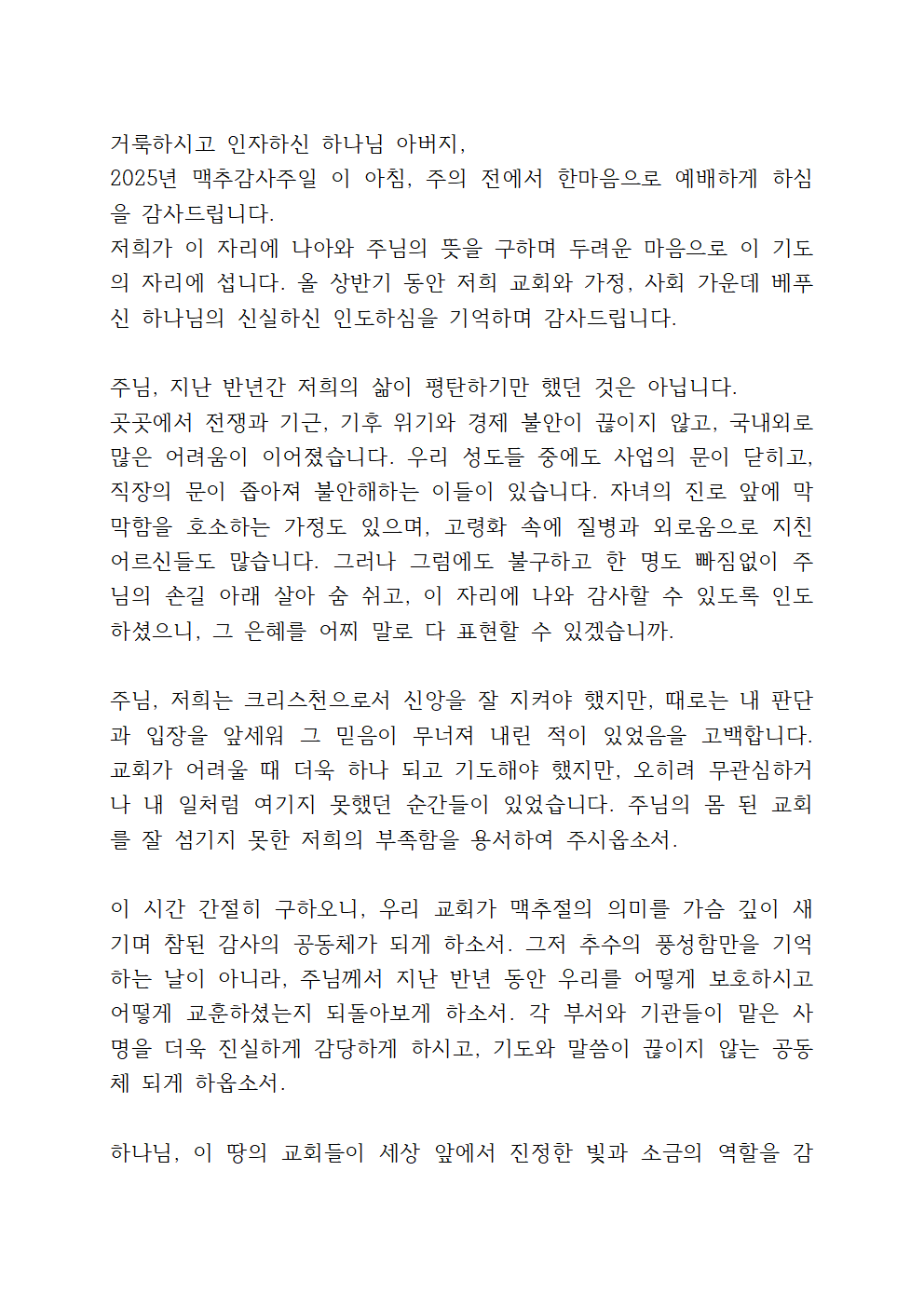 주님, 지난 반년간 저희의 삶이 평탄하기만 했던 것은 아닙니다. 곳곳에서 전쟁과 기근, 기후 위기와 경제 불안이 끊이지 않고, 국내외로 많은 어려움이 이어졌습니다. 우리 성도들 중에도 사업의 문이 닫히고, 직장의 문이 좁아져 불안해하는 이들이 있습니다. 자녀의 진로 앞에 막막함을 호소하는 가정도 있으며, 고령화 속에 질병과 외로움으로 지친 어르신들도 많습니다. 그러나 그럼에도 불구하고 한 명도 빠짐없이 주님의 손길 아래 살아 숨 쉬고, 이 자리에 나와 감사할 수 있도록 인도하셨으니, 그 은혜를 어찌 말로 다 표현할 수 있겠습니까.