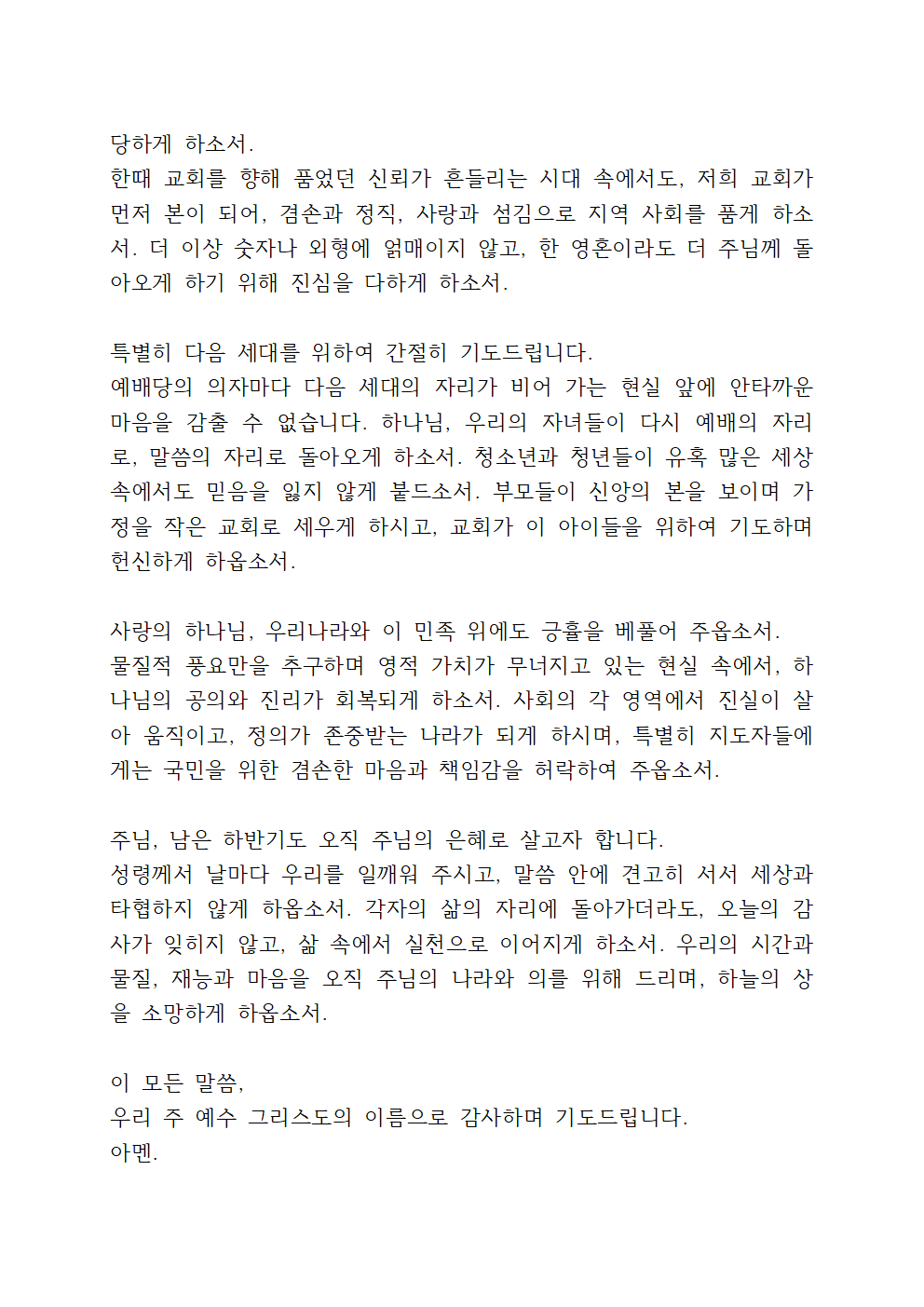 특별히 다음 세대를 위하여 간절히 기도드립니다. 예배당의 의자마다 다음 세대의 자리가 비어 가는 현실 앞에 안타까운 마음을 감출 수 없습니다. 하나님, 우리의 자녀들이 다시 예배의 자리로, 말씀의 자리로 돌아오게 하소서. 청소년과 청년들이 유혹 많은 세상 속에서도 믿음을 잃지 않게 붙드소서. 부모들이 신앙의 본을 보이며 가정을 작은 교회로 세우게 하시고, 교회가 이 아이들을 위하여 기도하며 헌신하게 하옵소서.