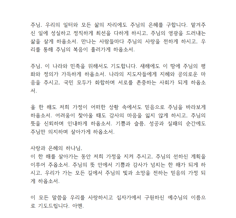 주님, 이 나라와 민족을 위해서도 기도합니다. 새해에도 이 땅에 주님의 평화와 정의가 가득하게 하옵소서. 나라의 지도자들에게 지혜와 공의로운 마음을 주시고, 국민 모두가 화합하며 서로를 존중하는 사회가 되게 하옵소서.