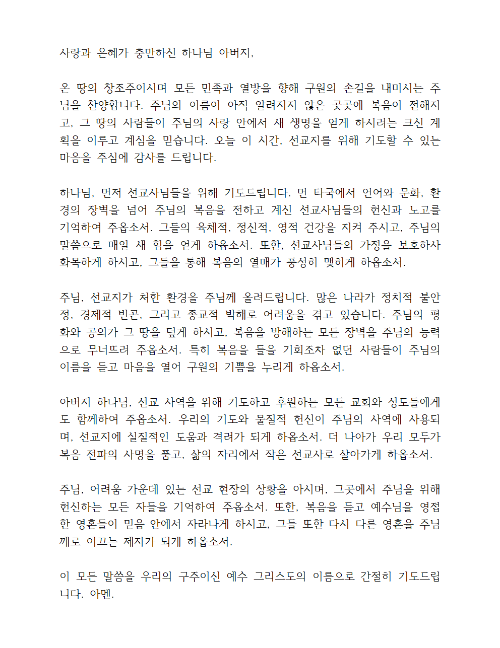 아버지 하나님, 선교 사역을 위해 기도하고 후원하는 모든 교회와 성도들에게도 함께하여 주옵소서. 우리의 기도와 물질적 헌신이 주님의 사역에 사용되며, 선교지에 실질적인 도움과 격려가 되게 하옵소서. 더 나아가 우리 모두가 복음 전파의 사명을 품고, 삶의 자리에서 작은 선교사로 살아가게 하옵소서.