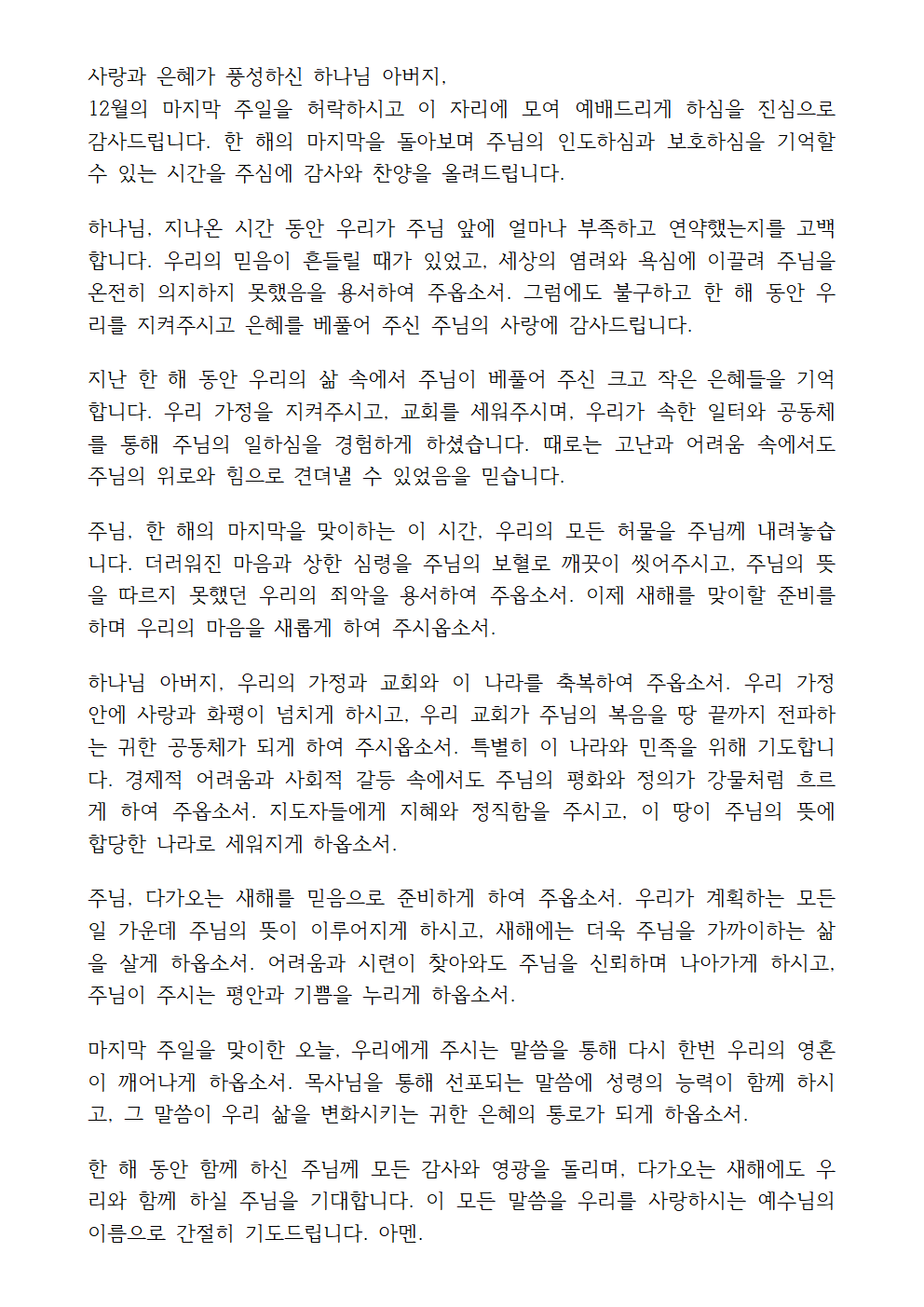 12월 마지막주일 대표기도문 맺음말
