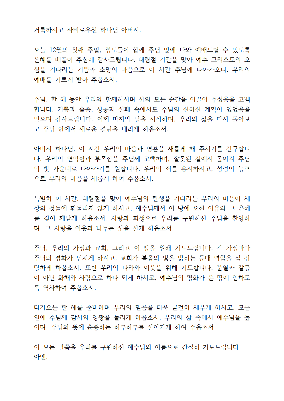 이 기도문은 12월 첫째 주일을 맞아 대림절의 의미를 되새기고, 한 해를 돌아보며 하나님의 은혜에 감사하는 내용을 중심으로 작성되었습니다.