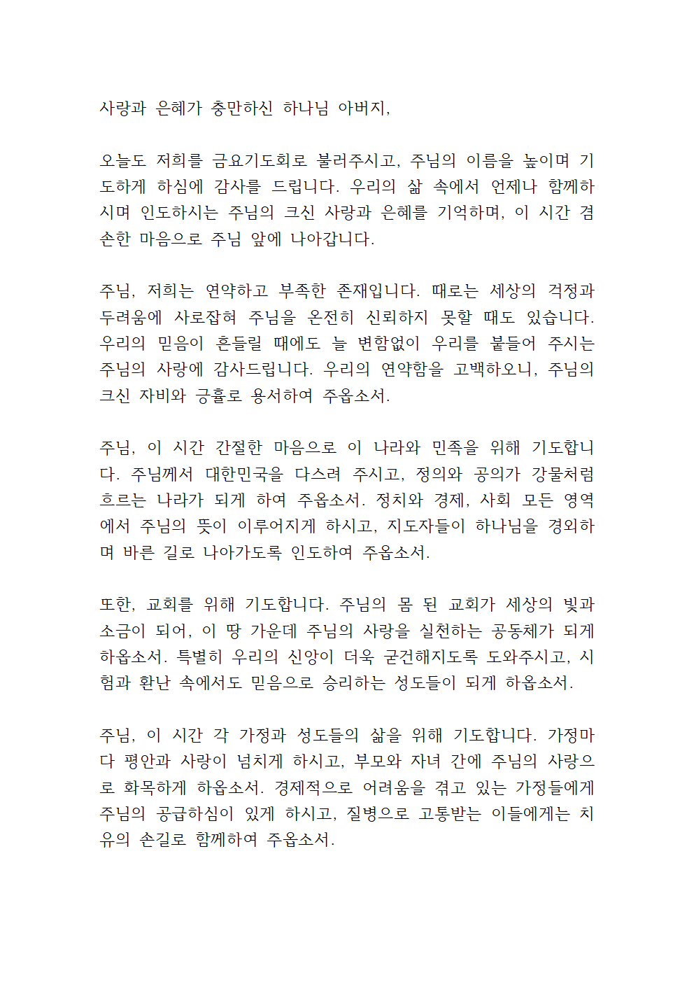 또한, 교회를 위해 기도합니다. 주님의 몸 된 교회가 세상의 빛과 소금이 되어, 이 땅 가운데 주님의 사랑을 실천하는 공동체가 되게 하옵소서. 특별히 우리의 신앙이 더욱 굳건해지도록 도와주시고, 시험과 환난 속에서도 믿음으로 승리하는 성도들이 되게 하옵소서.