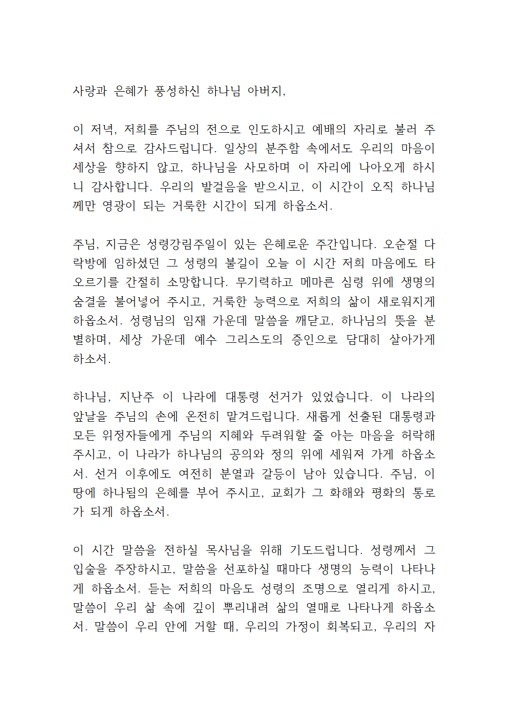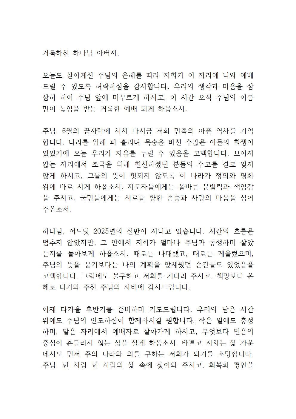 주님, 우리의 조국 대한민국이 하나님의 뜻 가운데 바로 서는 나라가 되게 하옵소서. 물질의 풍요보다 주님의 진리 위에 세워지는 나라가 되게 하시고,