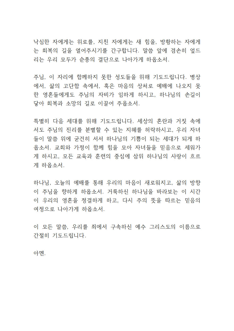 이 시간 드리는 예배 가운데 주님의 임재가 가득하게 하시고, 우리의 마음이 새로워지며, 주님의 말씀을 듣고 믿음으로 한 주를 살아가는 능력을 얻게 하옵소서. 말씀을 전하시는 목사님께 성령의 기름 부으심이 함께하셔서, 그 말씀이 우리의 영혼 깊은 곳까지 울림이 되게 하시고, 삶의 방향이 되게 하옵소서.