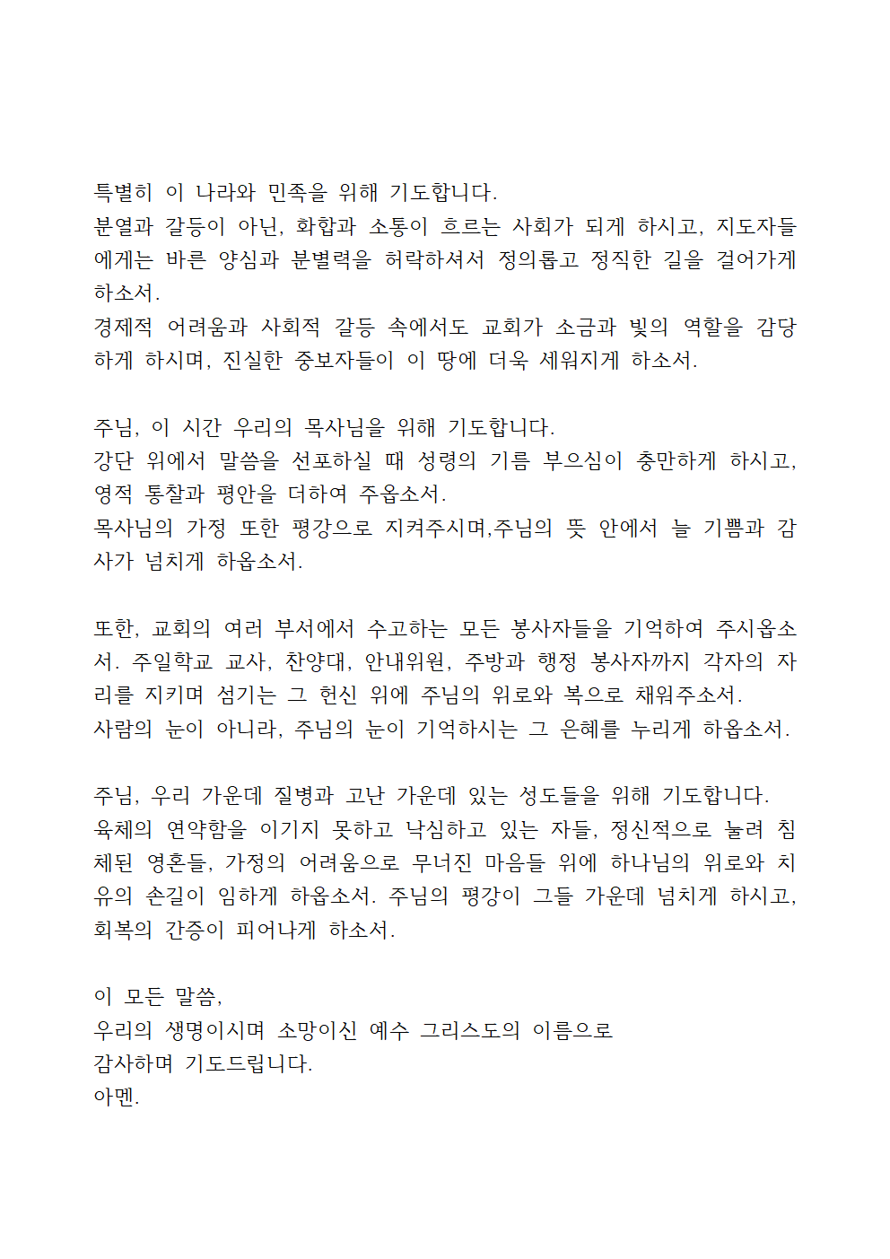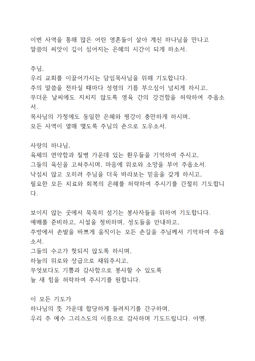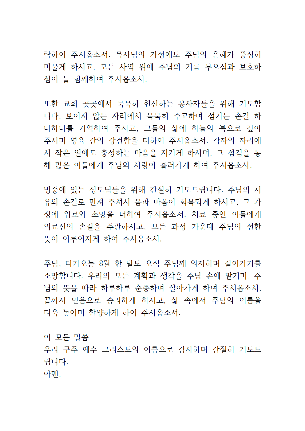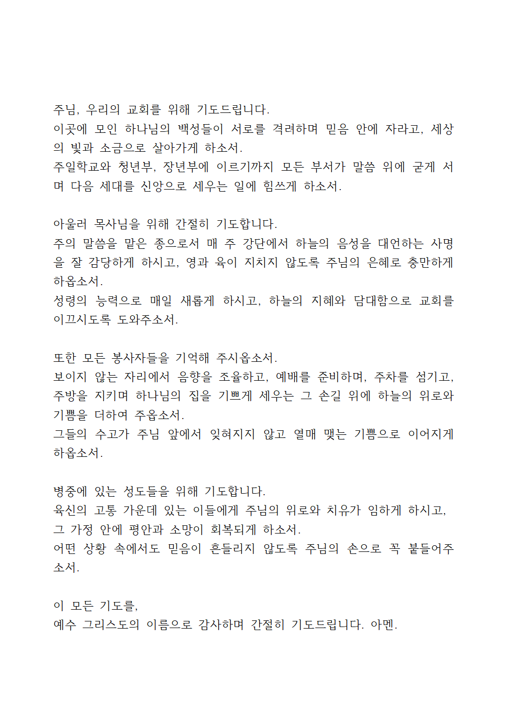 주님, 더위와 분주함 속에 우리의 믿음이 흐려지지 않도록 붙들어 주시며, 오히려 더욱 주님을 의지하고 말씀과 기도로 무장하는 믿음의 군사 되게 하옵소서. 삶의 작은 일상 속에서도 주님의 뜻을 구하며 순종하며 살아가는 저희 모두가 되게 하시고, 주님의 사랑과 은혜를 이웃과 나누는 복된 통로가 되게 하옵소서. 여름철에 진행되는 교회학교 여름성경학교, 청소년 수련회, 각 기관의 여름 사역과 선교활동 위에 주님의 크신 인도하심과 보호하심을 허락하셔서, 참여하는 모든 이들이 주님의 사랑을 깊이 체험하며 믿음이 자라게 하옵소서.