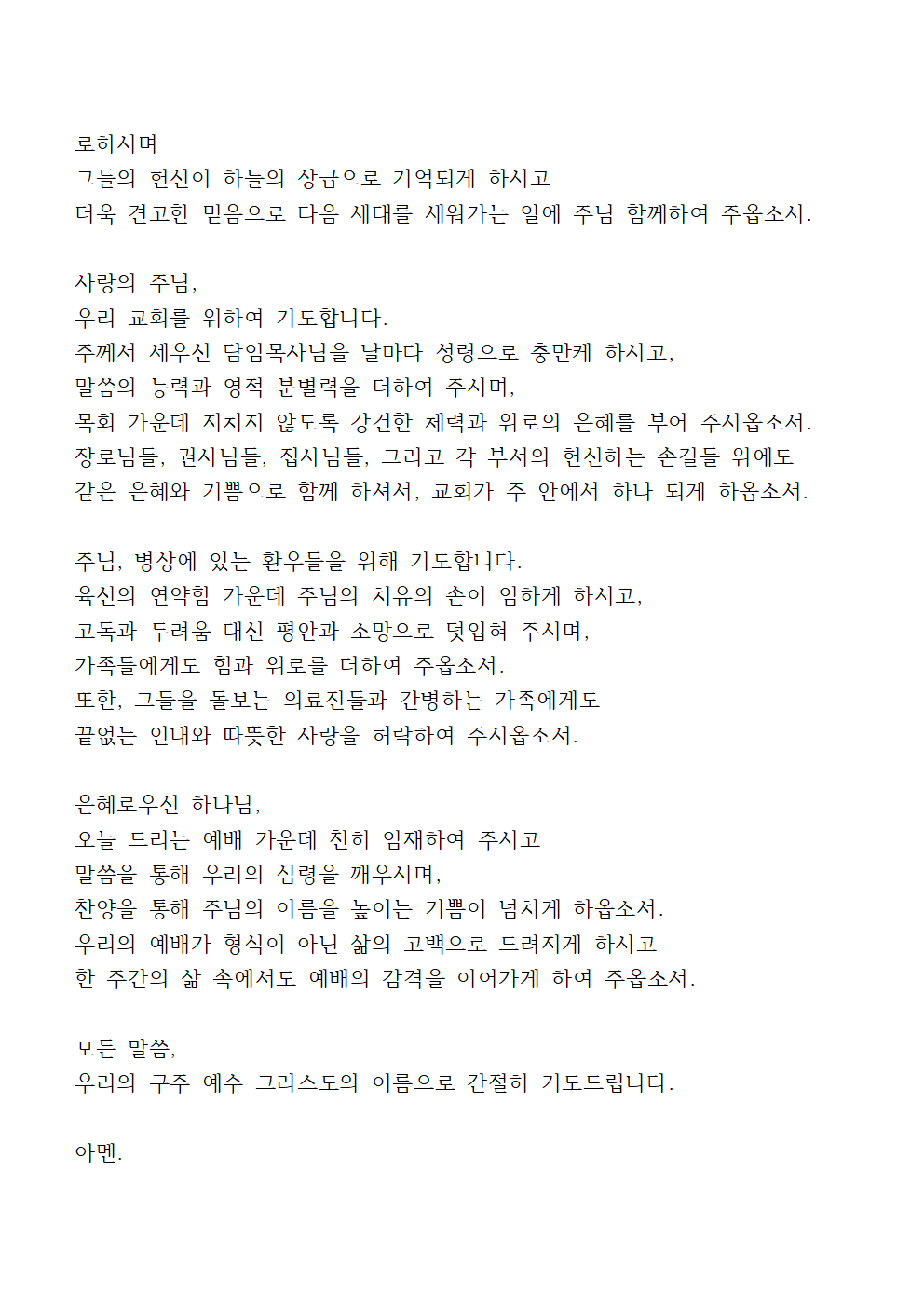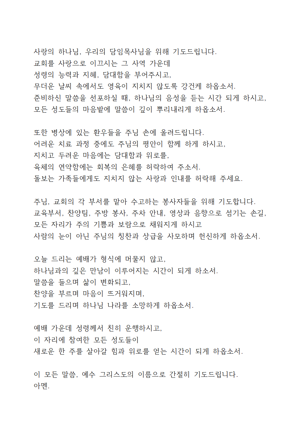 말씀을 전하시는 목사님께 성령의 능력을 더하시고, 그 말씀을 받는 모든 심령이 결단과 변화로 응답하게 하옵소서.
