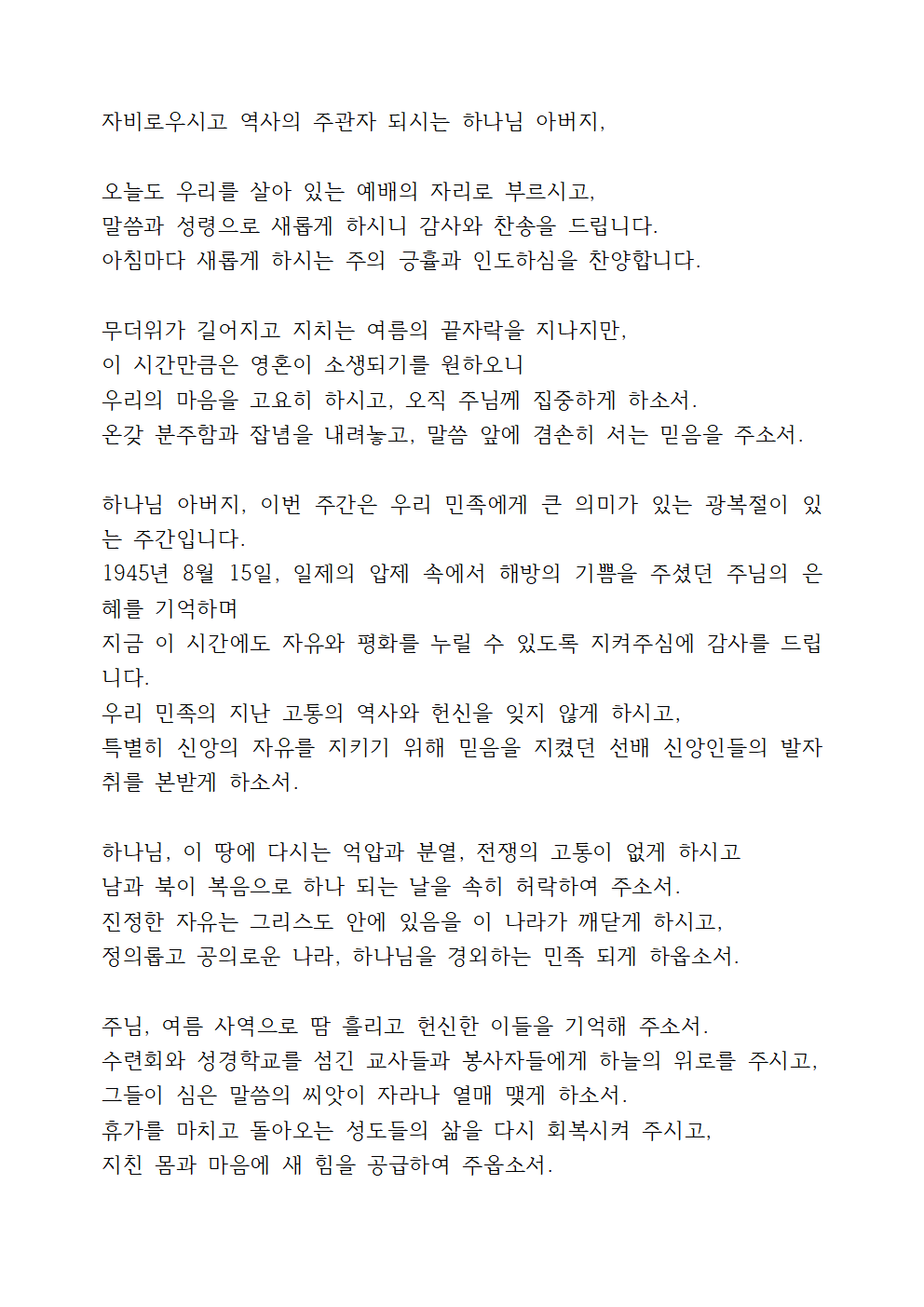 수많은 희생 위에 세워진 오늘의 자유와 평화를 가볍게 여기지 않게 하시고, 이제는 우리가 기도로 지켜내는 세대가 되게 하옵소서.